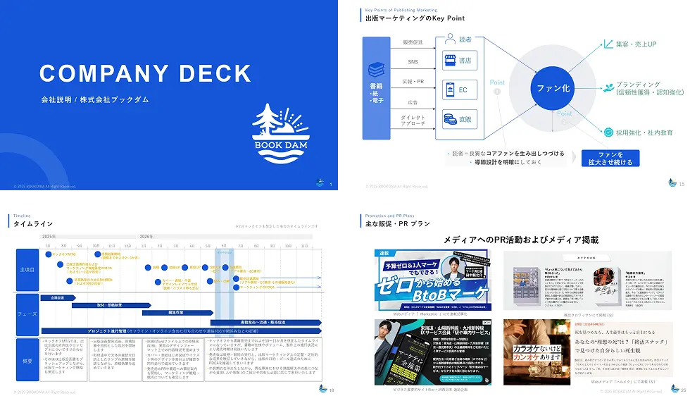 ブックダムは、出版を通じて御社のビジョン実現を支援します。私たちの企業出版がビジネス成長の新たな武器となる理由を、まずは資料請求でお確かめください。